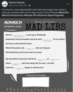 Get your customers involved. Something as simple as creating a bingo sheet or a “This or That” game centered around your company is a great way to get your customers involved from home. Encourage them to share on their social media pages and tag your company — they get to enjoy the game and you get your name out there to all of their followers!