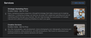 Facebook especially has great sections on Facebook for Business to showcase your company and tell your customers what you do. Consider adding your services and price points so that potential customers can learn more about what you do without having to search for it elsewhere. Also take advantage of the “About” section on Facebook for Business. Here, you can add which category your business is considered, business details, and even a menu (if that applies).