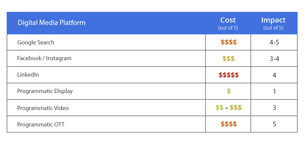 Considering the targeting and placement of OTT advertising, it is relatively high impact. We place it on a 4 out of a 5 point scale for viewing impact – similar to that of standard programmatic video but a step ahead due to the nature of a large screen, long format ad. Likewise, due to the cost of targeting and limited inventory, programmatic OTT ranges on the higher end of the cost spectrum as well, roughly a 5 out of 5 as well.