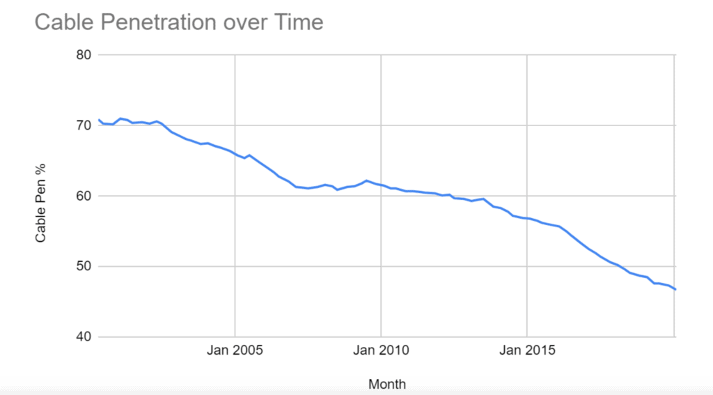 Another thing to consider is the prominence of ‘cutting the cord’. Below, there is a chart measuring the percentage of households with a television that have a wired cable subscription over time.