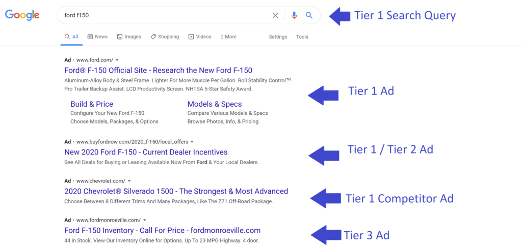Tier 1 advertising tactics generally focus on those larger-scale advertisements, like endorsements and large event sponsorships, national TV buys, etc. A common example of Tier 1 advertising would be Superbowl commercials for car companies or Moto America sponsorships by Powersports manufacturers, or even a similar national circuit by an oil company (Lucas Oil). Another would be full-page takeovers on national websites like Cars.com (vertical example) or Forbes.com (general example). In paid search, Tier 1 advertising focuses on broader keywords in the industry, specific to the brand or model, or specific to the competitive brands or models.